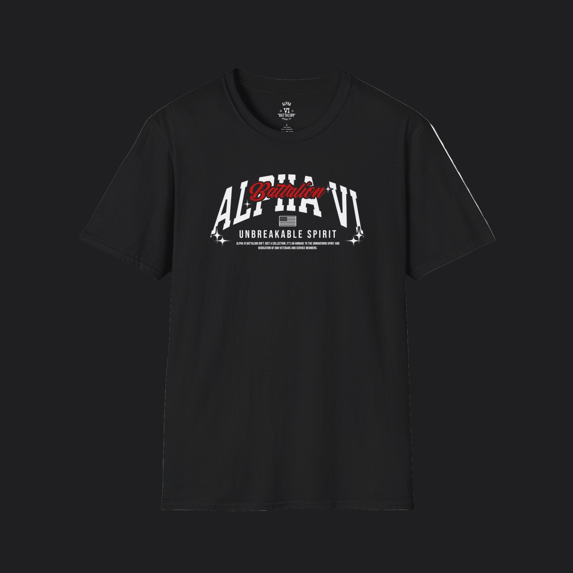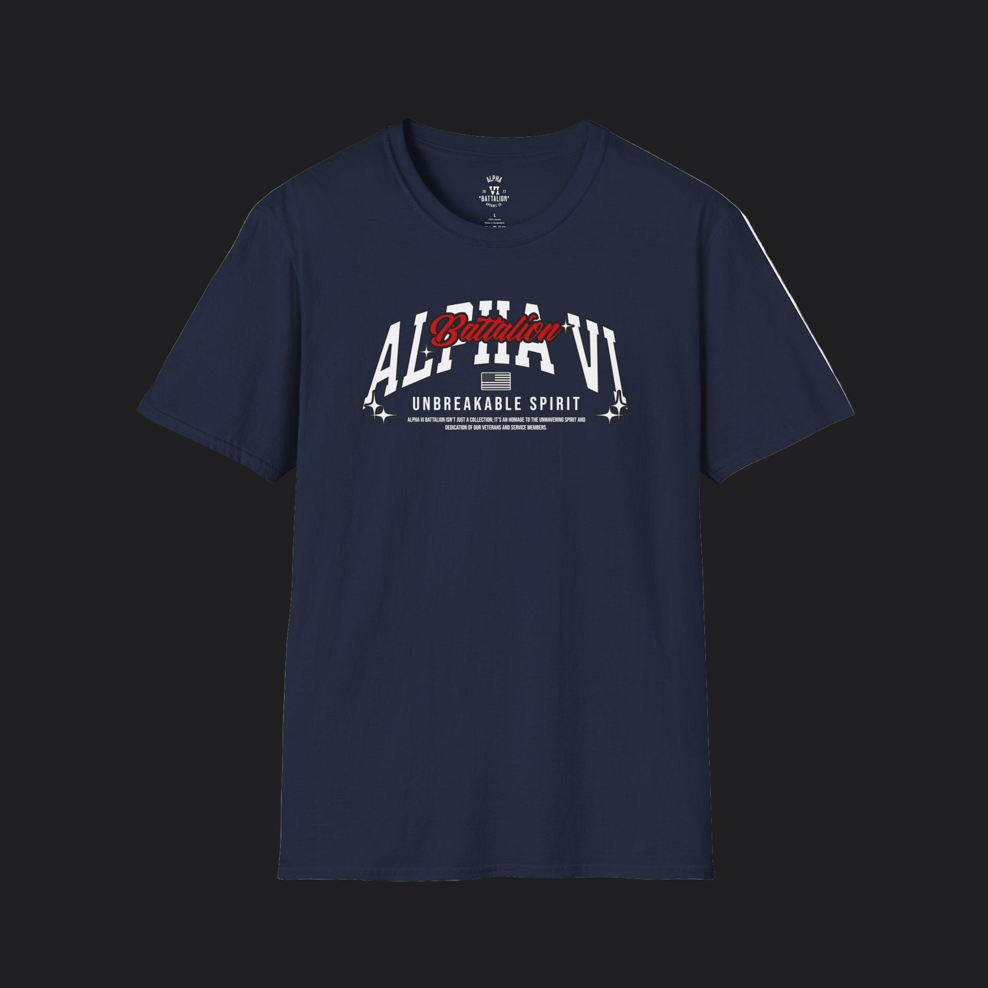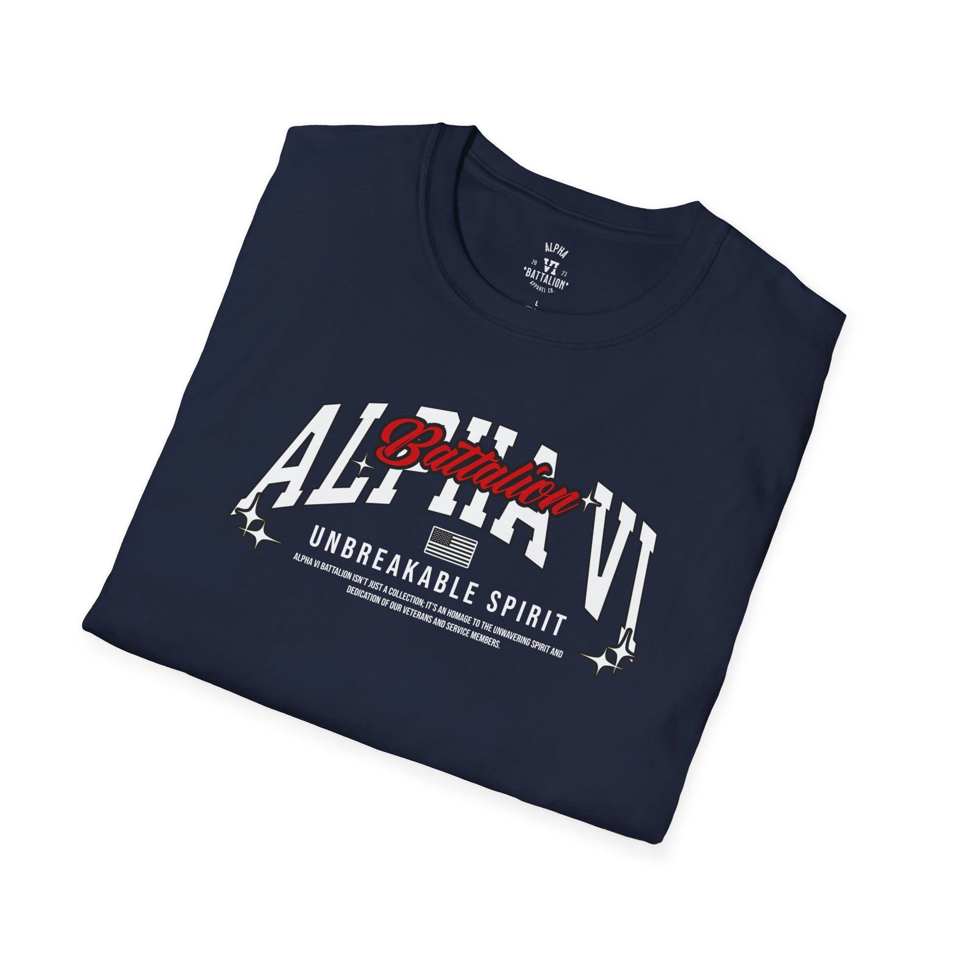 The Unbreakable Spirit Tee embodies resilience, pride, and loyalty to the Pack. The design features bold collegiate-style lettering with Alpha VI front and center, accented by the script “Battalion” in striking red. Beneath it, the phrase Unbreakable Spirit reinforces the strength and determination that define Alpha VI. Finished with subtle star accents and a flag detail, this shirt carries the energy of grit, endurance, and unity.