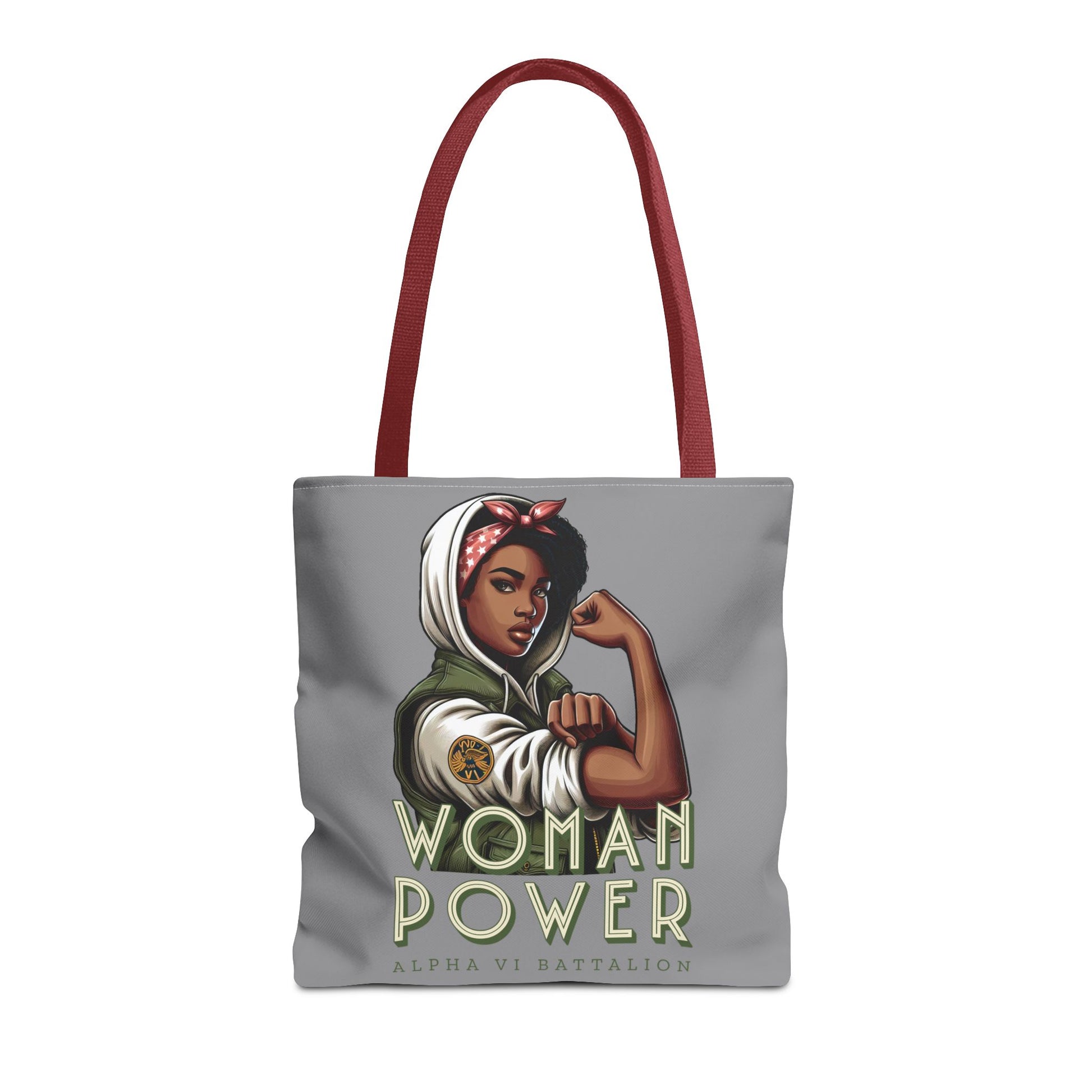 Celebrate Women's International Month with the Alpha VI Battalion Heritage Edition Rosie Tote Bag (Woman Power). This modern interpretation of the iconic Rosie pose features a Black service member veteran, honoring the legacy, pride, and unwavering strength carried by generations of Black women in uniform.