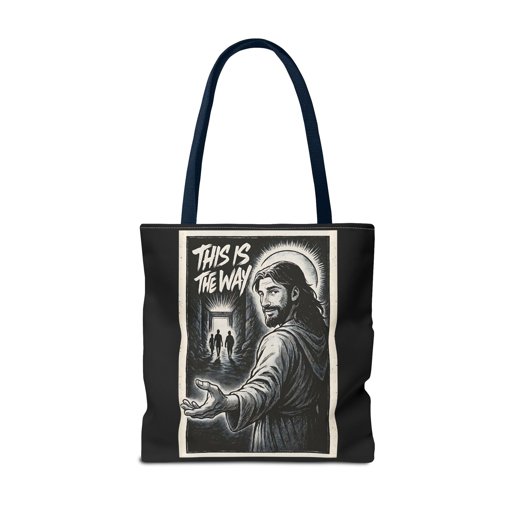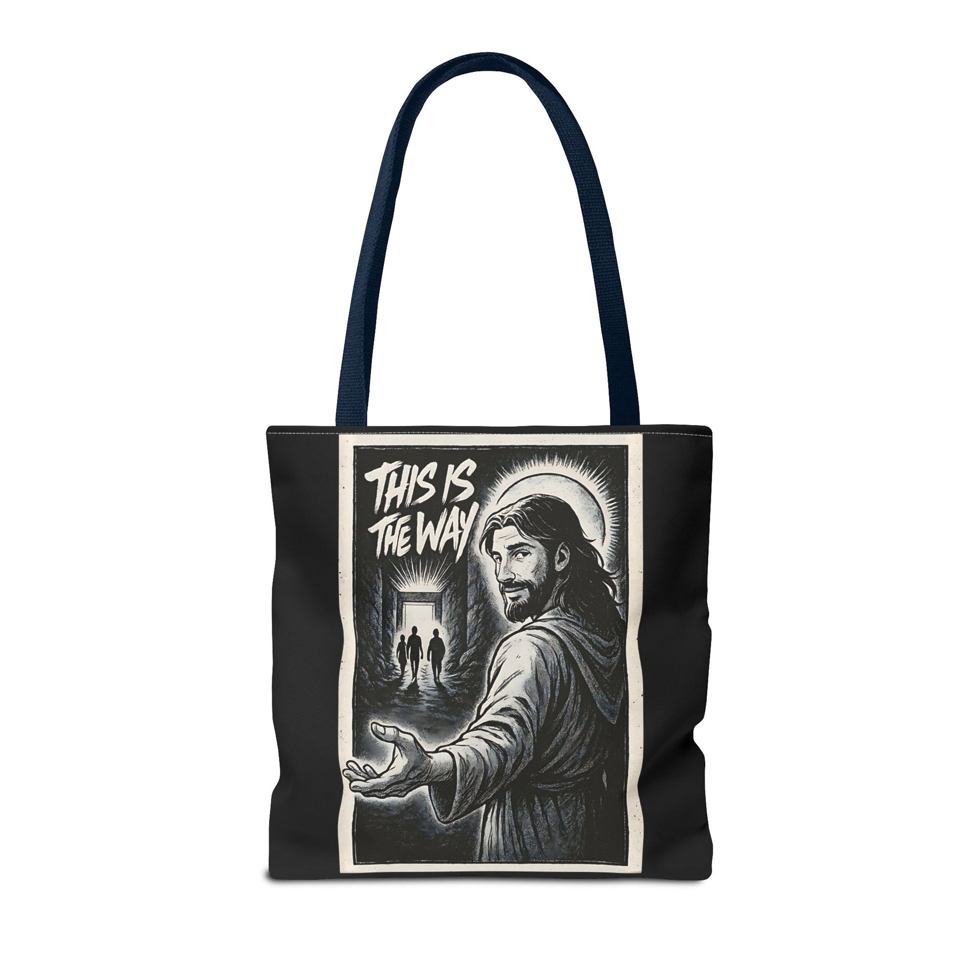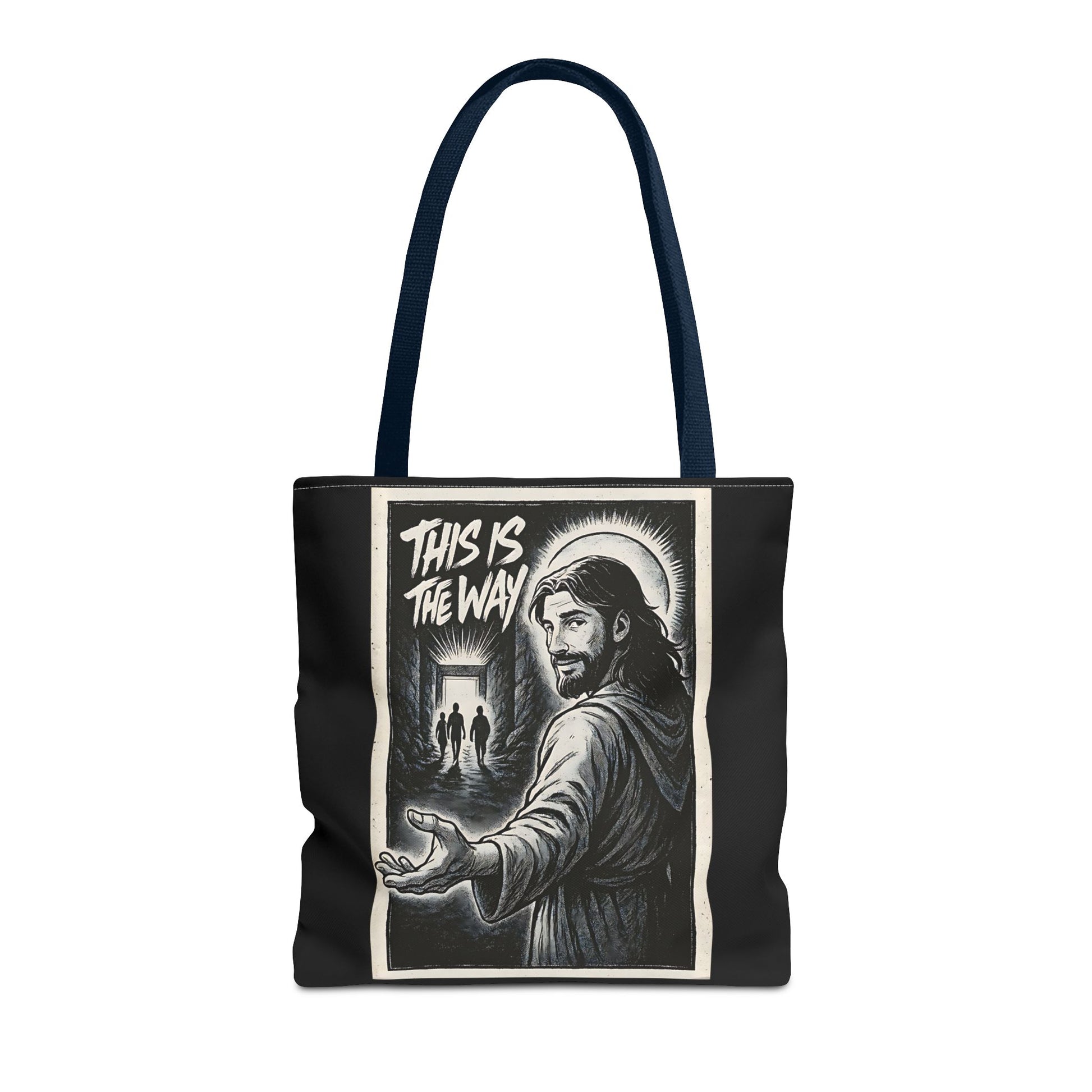 Carry a message of faith and direction with the Alpha VI Battalion “THIS IS THE WAY” Tote Bag. Featuring a bold, illustrated depiction of Christ offering guidance through the narrow path, this design captures the heart of strength, purpose, and unwavering conviction.