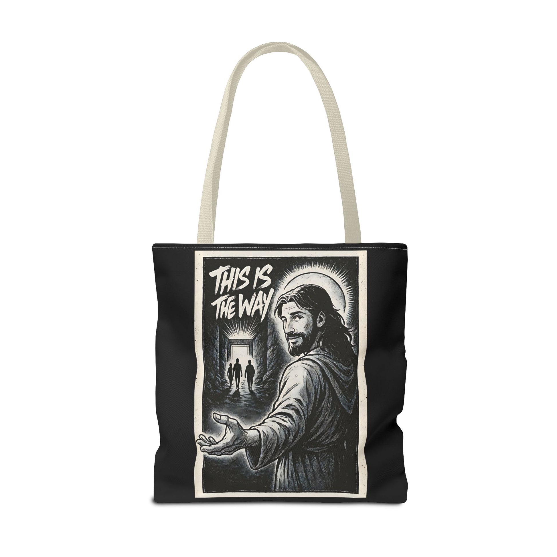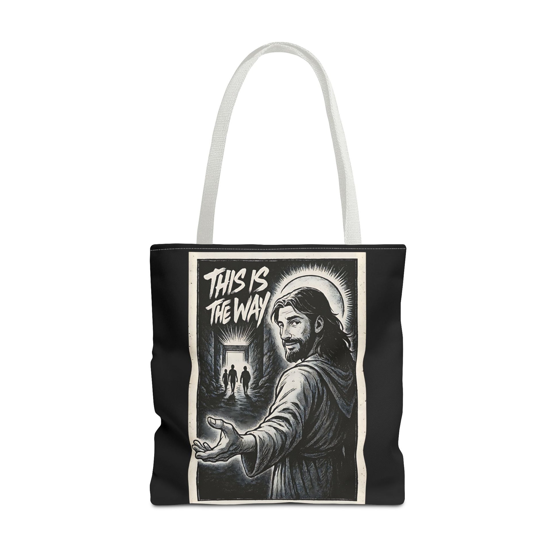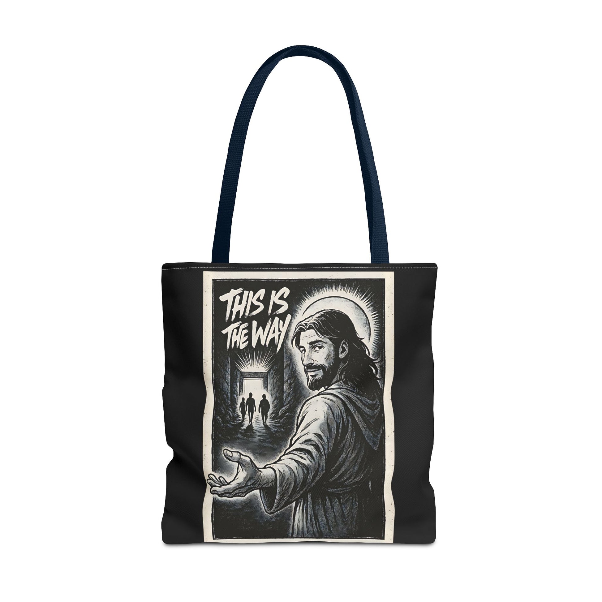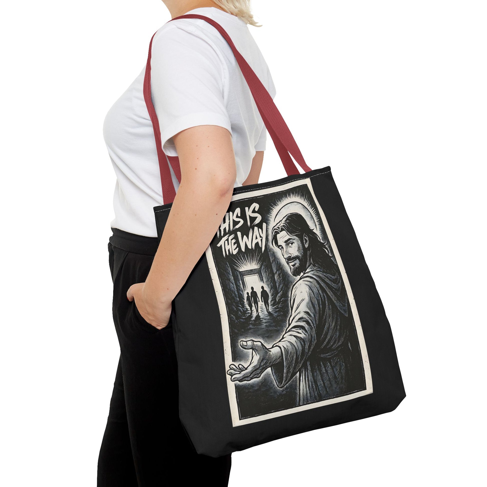 Carry a message of faith and direction with the Alpha VI Battalion “THIS IS THE WAY” Tote Bag. Featuring a bold, illustrated depiction of Christ offering guidance through the narrow path, this design captures the heart of strength, purpose, and unwavering conviction.